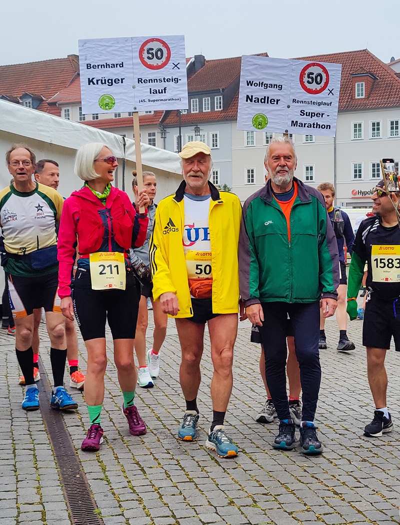 Es war beeindruckend, als Bernhard Krüger und Wolfgang Nadler, beide am Start ihres 50. Rennsteiglaufes, Wolfgang sogar bei seinem 50. Supermarathon, unter den Klängen von Conquest of Paradise und tosendem Beifall zur Startlinie auf dem Marktplatz in Eisenach geführt worden sind und wenig später mit uns und ca. 1700 weiteren Läufern über die 73,9 km nach Schmiedefeld unterwegs waren, ich bei meiner 44. Auflage …