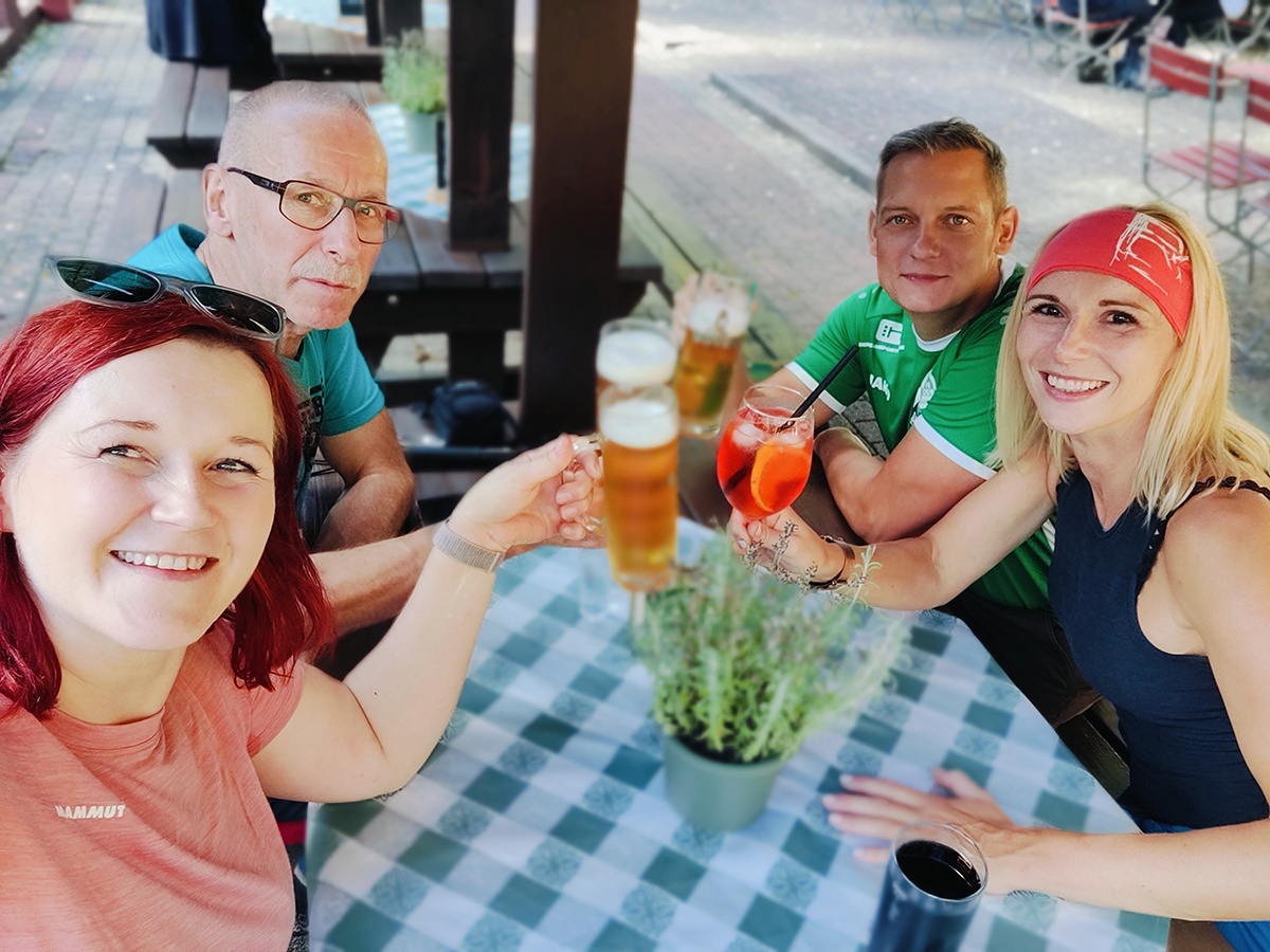 Nur so viel: beide habe die Tour hervorragend gemeistert, klar hatte es hier und da ein Zögern und Zittern gegeben, aber die Freude, als wir oben auf den Erfolg anstoßen konnten, war unübersehbar.